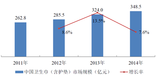 根据中国造纸协会生活用纸专业委员会的数据,2011 年至2014 年,卫生巾(含护垫)消费量从875.0 亿片增加到1,025.8 亿片,年复合增长率达到5.44%,市场规模从262.8 亿元扩大至348.5 亿元,年复合增长率达到9.86%。
