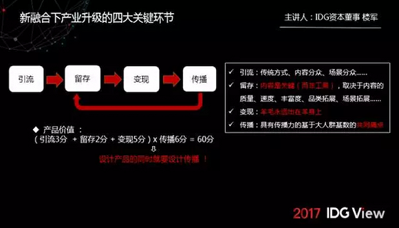 如果我们用分数去衡量四个环节,前面三个是加法,最后是乘法。某个产品的价值如果引流有3分,留存2分,变现5分,这个产品加起来可能是10分,乘上传播的6分,这个产品就是60分。还有一点要特别注意的,千万不要在产品做好之后,再想着怎么传播,而是在设计产品的时候,就要把传播结合进去。
