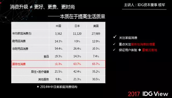 这个现象背后的含义是,当一个家庭越来越接近中产水平,他们的钱更多会花在体验上,而不是从一年买40件衣服增加到明年买80件,要提高的是生活质量。因此,我们认为服务性消费增量是一个重要的大方向,做消费升级更应该关注家庭消费;如果大方向偏了,做任何创业都有可能变成小而美的事情。