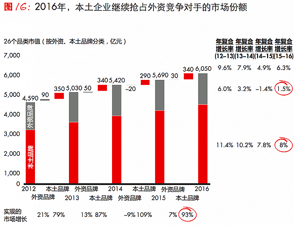 近期,管理咨询公司贝恩公司与凯度消费者指数发布调查报告显示,2016年中国本土品牌实现了8.4%的增长,贡献了中国快速消费品市场93%的增长额。与之相比,外资品牌仅增长1.5%。