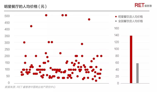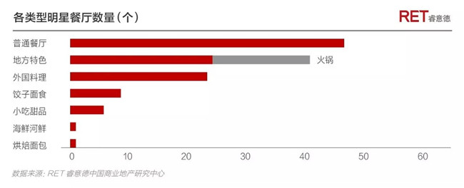 在对明星店调研的过程中,RET睿意德中国商业地产研究中心发现,餐饮因投资较少、风险相对较小,成为明星开店首选,占全部明星店的六成。明星餐厅人均消费140元,明显高于普通餐厅。在口味方面,明星开店往往结合自身偏好和生活背景选择不同的餐饮类别。其中火锅因其标准化程度高、盈利能力强,成为了明星店餐饮业态中的热门选项之一。