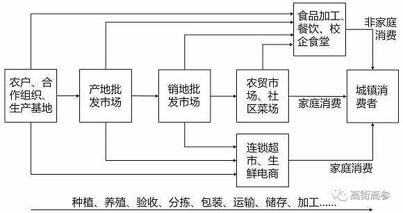 国内最基本的“五站式”流通模式,农户——产地批发市场——销地批发市场——零售商——消费者,层层交易,其中心主体是产、销地批发市场。为了让“菜篮子”来到城镇居民的家门口,销地批发市场与消费者之间往往有多级分销商。