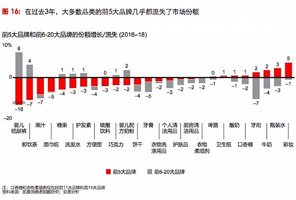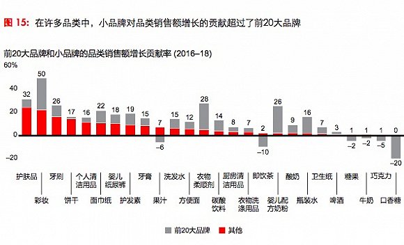 该报告给出了前20大品牌与小品牌相比的增长情况——许多品类中,小品牌对品类销售额增长的贡献超过了前20大品牌(注:前20大品牌是指营业额排名前20的品牌)。