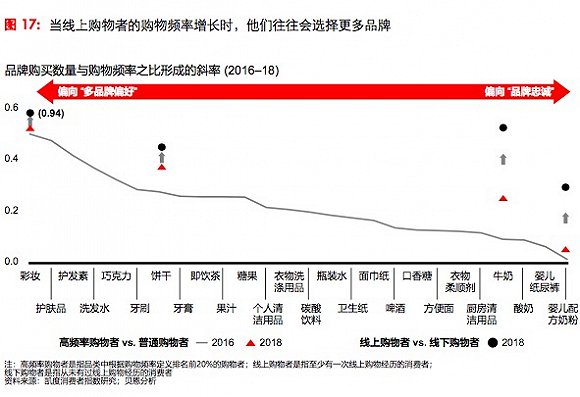 另一个使小品牌鹊起的原因是中国消费者的“多品牌偏好”行为日益明显。凯度消费者指数研究的四个品类(彩妆、饼干、牛奶和婴儿配方奶粉),是多品牌偏好-品牌忠诚区间和低频-高频线上渗透率维度的代表。这四个品类的多品牌偏好行为较两年前更明显。而且,线上消费者的多品牌偏好行为比线下消费者更为明显。随着越来越多消费者进行网购,他们的多品牌偏好行为将会增加。