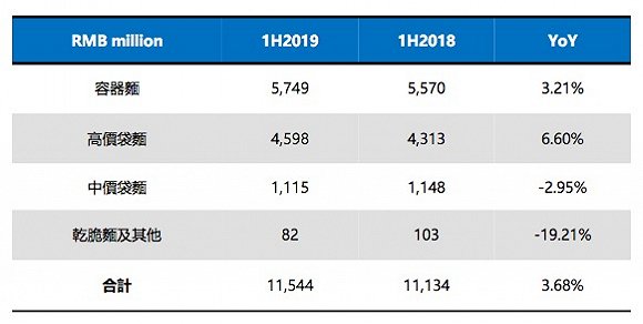 财报显示,2019年上半年,康师傅方便面业务收益为115.44亿元,同比增长3.68%,净利润同比上升31.24%至8.75亿元。