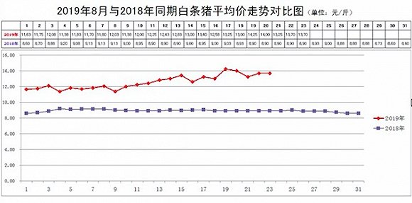 8月23日,新发地市场白条猪批发平均价是13.70元/斤,比8月16日的12.58元/斤上涨8.90%;比7月23日的11.0元/斤上涨24.55%;比2018年8月23日的8.90元/斤上涨53.93%。