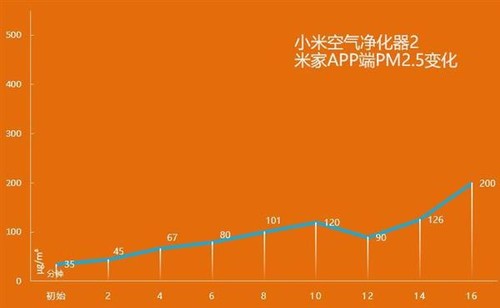 小米空气净化器2测得的PM2.5数据虽说与352 PM2.5检测仪呈现的数据差异比较大,但同样整体呈上升趋势,在16分钟的时候已经达到了200μg/m3,此时在自动档运行的它风量明显加大。