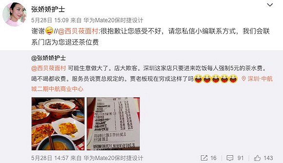 事情源于微博网友@张娇娇护士日前在微博发布的一条帖子。5月28日,这位网友在深圳一家西贝莜面村就餐时,被强制收取了每人5元的茶水费。被@的西贝莜面村官微随后在她的评论区致歉,并表示将退还茶位费。