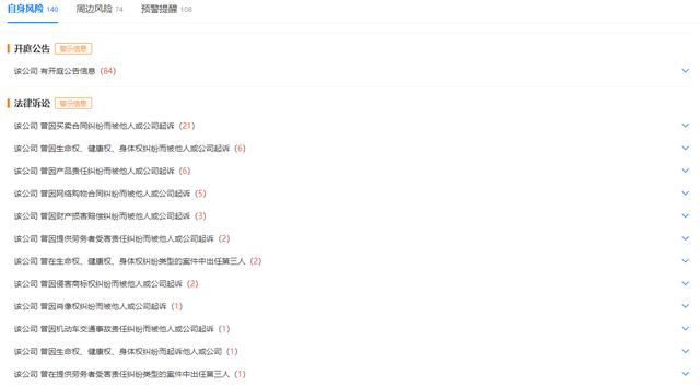 此外,盒马鲜生的周边风险为74条,盒马鲜生旗下各分公司被累计起诉16次,累计受到行政处罚49次,原因同样多为“食品安全”相关问题。