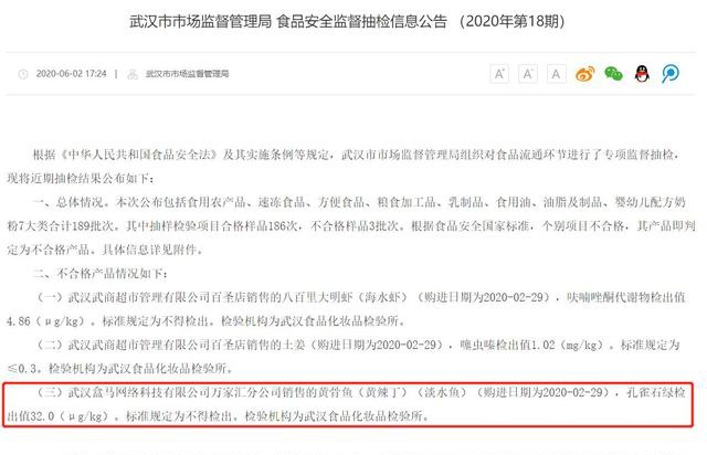 6月2日,武汉市市场监管局发布食品安全监督抽检信息公告(2020年第18期),武汉盒马网络科技有限公司万家汇分公司销售的黄骨鱼(黄辣丁)(淡水鱼)(购进日期为2020-02-29),孔雀石绿检出值32.0(μg/kg)。标准规定为不得检出。