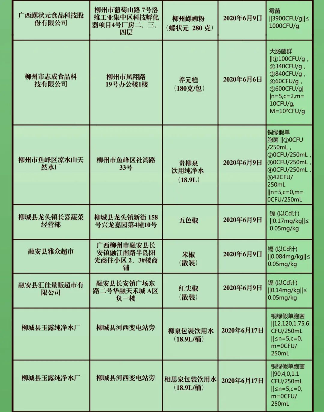 此外,还有好几个厂家的纯净水不合格。鱼峰区社湾路33号凉水山天然水厂的贵柳泉饮用纯净水(2020年6月9日生产),铜绿假单胞菌超标。柳城县河西变电站旁的柳城县玉露纯净水厂的玉露、相思泉、杨柳泉包装饮用水(2020年6月17日生产),也都是铜绿假单胞菌超标。
