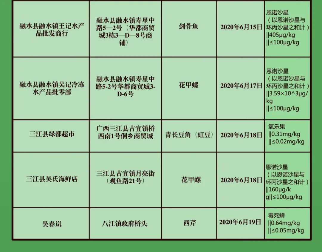 不合格产品还涉及一些水产、海鲜,包括花甲螺、黄蜂鱼、花蟹、剑骨鱼。鹿寨县鹿寨市场一家门面的花甲螺还检出含有氯霉素,该市场一家门店的花蟹镉超标。融水苗族自治县融水镇寿星中路华都商贸一家门店的剑骨鱼,恩诺沙星超标。