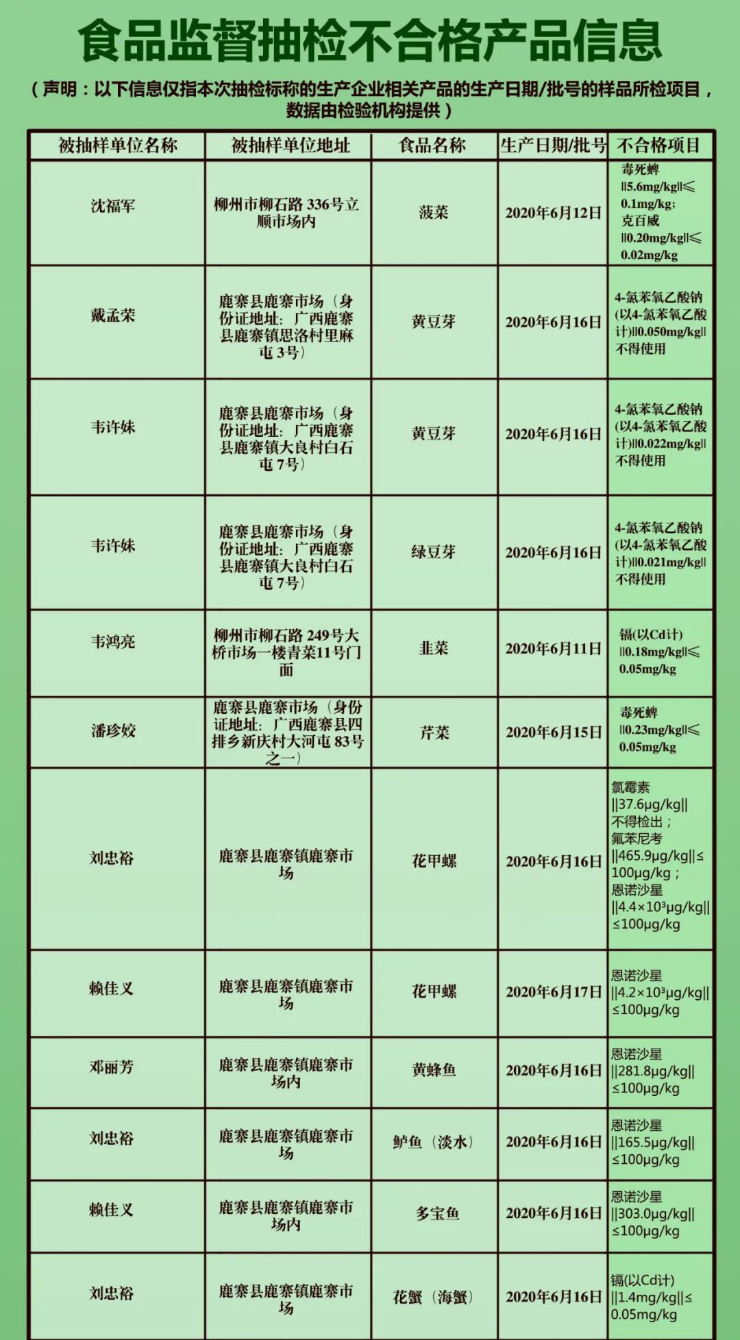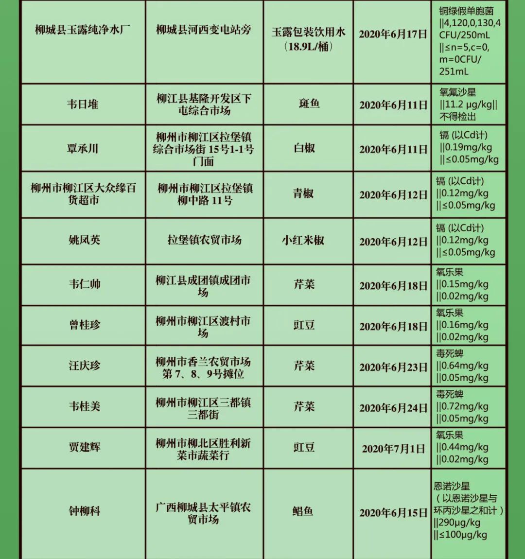 记者从公布的名单上看到,不合格产品主要有蔬菜,包括菠菜、豆芽、韭菜、芹菜、辣椒等。柳石路249号大桥市场一楼一家门面的韭菜镉超标,柳石路336号立顺市场内一家门店菠菜中农药毒死蜱、百克威超标。其他不合格青菜,还有来自鹿寨县鹿寨市场、融安县长安镇半岛阳光小区、华融天禾城小区等处。