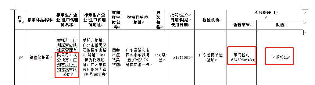 经广东省药品检验所检测,广州市科臣生物技术有限公司生产的祛痘修护霜(批号P1911001)因检出苯海拉明1624595mg/kg不合格。