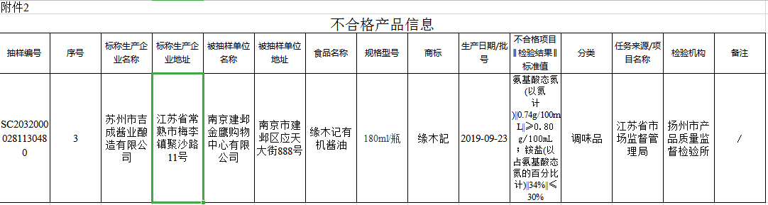本次抽检发现,由苏州市吉成酱业酿造有限公司生产、南京建邺金鹰购物中心有限公司销售的缘木记有机酱油抽检不合格。该酱油规格型号为180ml/瓶,分类为调味品,商标为缘木記,生产日期/批号为2019年9月23日,不合格项目为氨基酸态氮(以氮计)和铵盐(以占氨基酸态氮的百分比计),其中,氨基酸态氮(以氮计)检验结果为0.74g/100mL,标准值为≥0.80 g/100mL;铵盐(以占氨基酸态氮的百分比计)检验结果为34%,标准值为≤30%,检验机构为扬州市产品质量监督检验所。