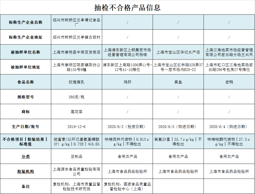 抽检信息显示,由绍兴市柯桥区兰亭傅记食品厂生产、上海市崇明县中商百货商店销售的玫瑰腐乳,不合格项目为甜蜜素。甜蜜素是一种常用甜味剂,其甜度是蔗糖的30—40倍。可广泛用于面包、糕点、饮料、配制酒、腌渍的蔬菜及蜜饯等食品中。长期过量食用甜蜜素超标的食品,可能会对人体健康造成一定影响。