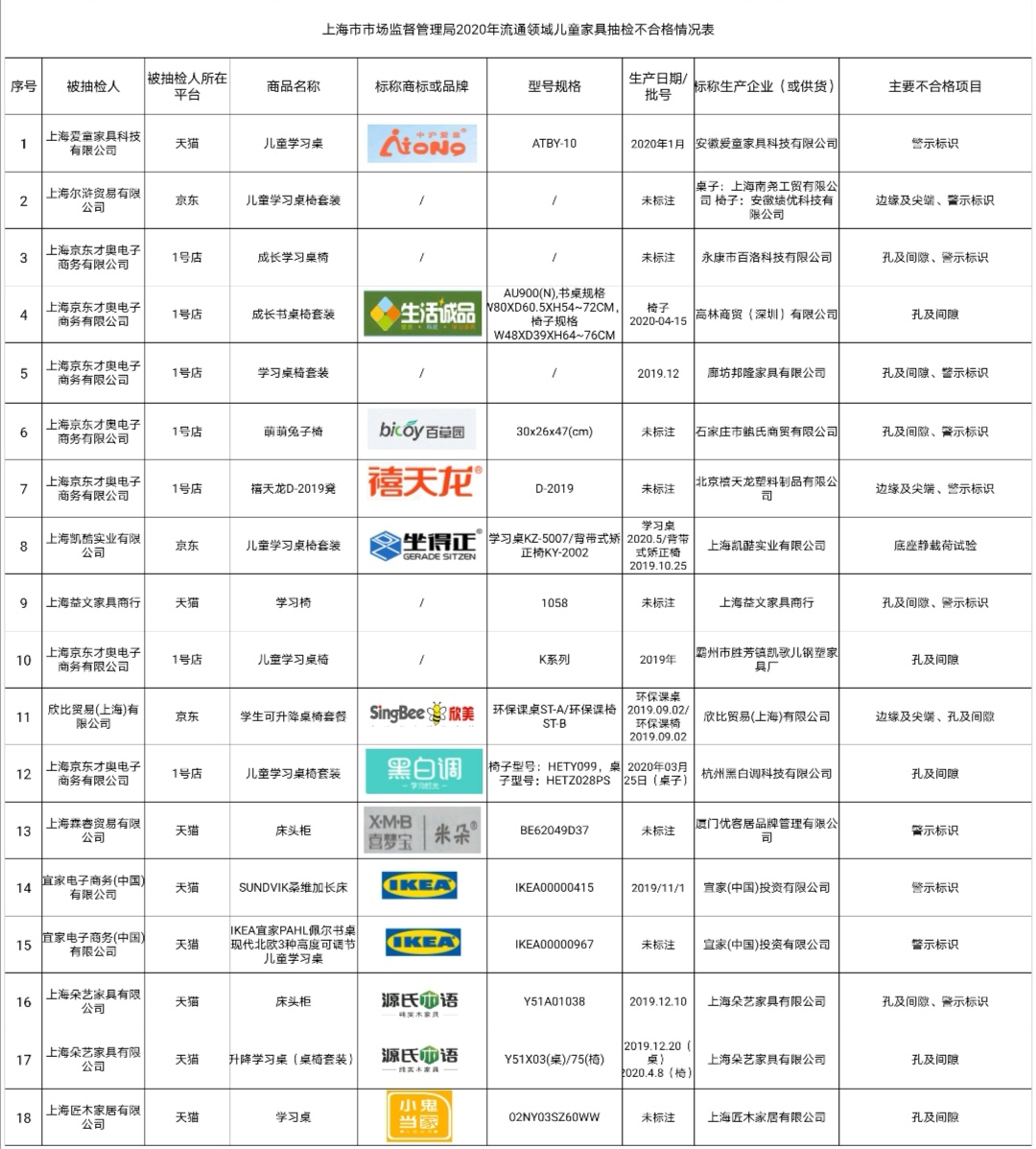 近期,上海市场监管局集中组织执法力量对天猫、京东、1号店3个网络交易平台销售的25批次儿童家具进行了市场检查和质量抽查,经检测,有18批次不合格,不合格检出率为72%。不合格项目分别是边缘及尖端、孔及间隙、底座静载荷试验和警示标识四项。