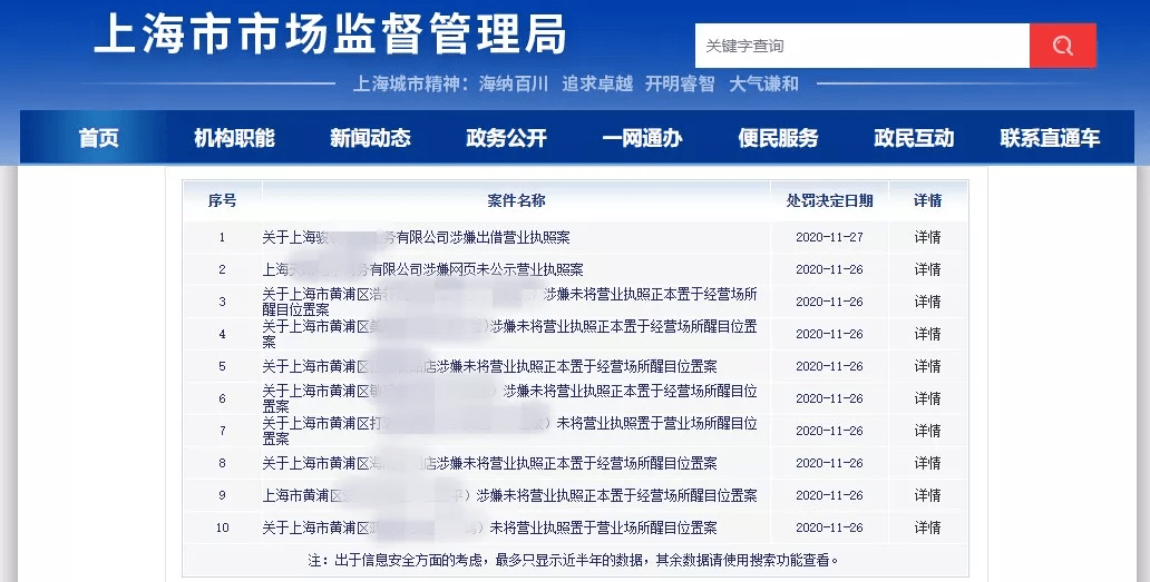 记者查阅上海市市场监管局公示的行政处罚信息,今年11月1日至11月27日,至少有15家经营者因涉嫌未将营业执照正本置于经营场所醒目位置,而被上海各级市场监管部门查处。