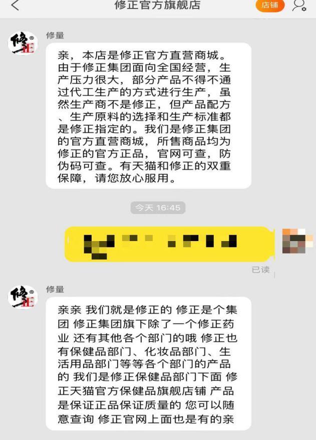 记者发现,上述判决书提及的网店“百年修正旗舰店”,其运营方虽然公司名称(滋美堂茶业公司)与修正药业看似并无关联,但店铺处处彰显修正药业的品牌,如店铺首页显著位置有修正药业的知名广告语“修正的、良心的、放心的”,店铺上方还有平台标识“品牌直销”,店铺上方下方均有修正药业的品牌logo。该网店“百年修正旗舰店”店铺客服同时告知记者,“我们是修正集团官方直营商城”,虽然部分产品是代工生产,“但产品配方、生产原料的选择和生产标准都是修正指定的。”