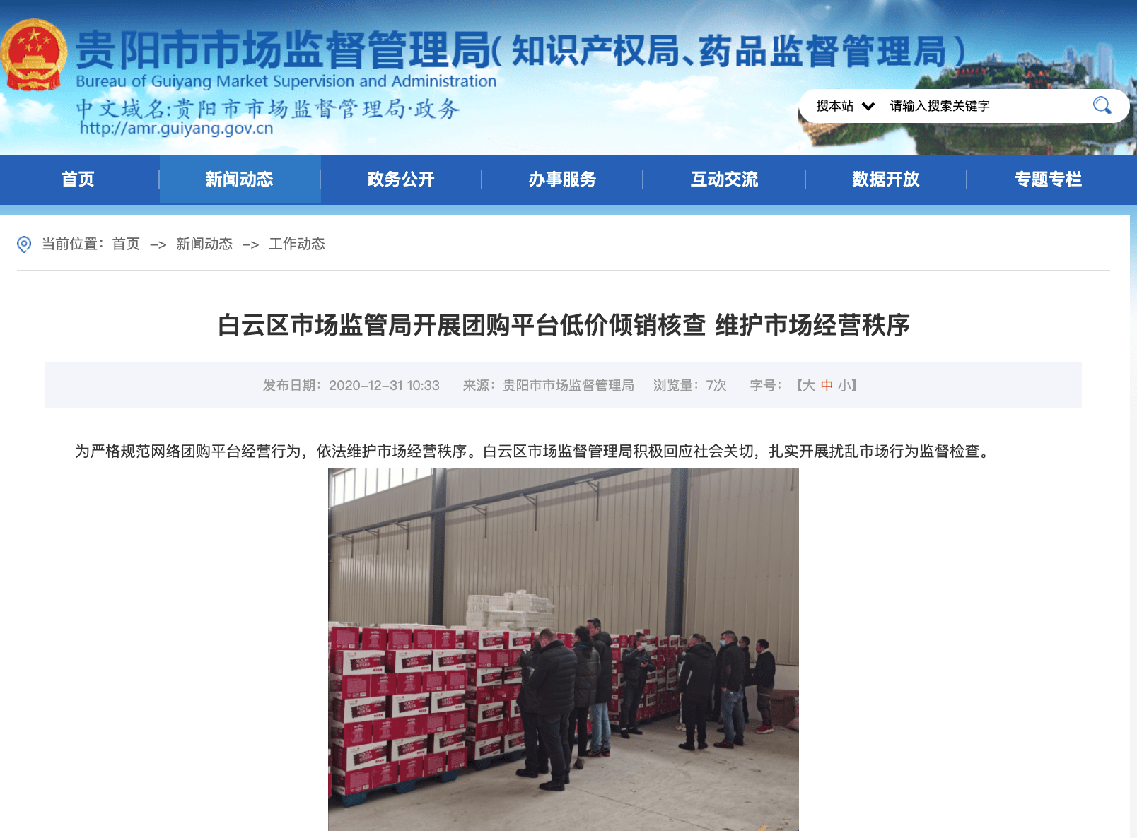 随后,白云区市场监管局对该网络团购平台贵州区域负责人及仓储提供方负责人开展了约谈。对于该网络团购平台涉嫌的低于成本价销售行为和涂改破坏商品包装标识的违法违规行为,白云区市场监管局将进一步深入调查。