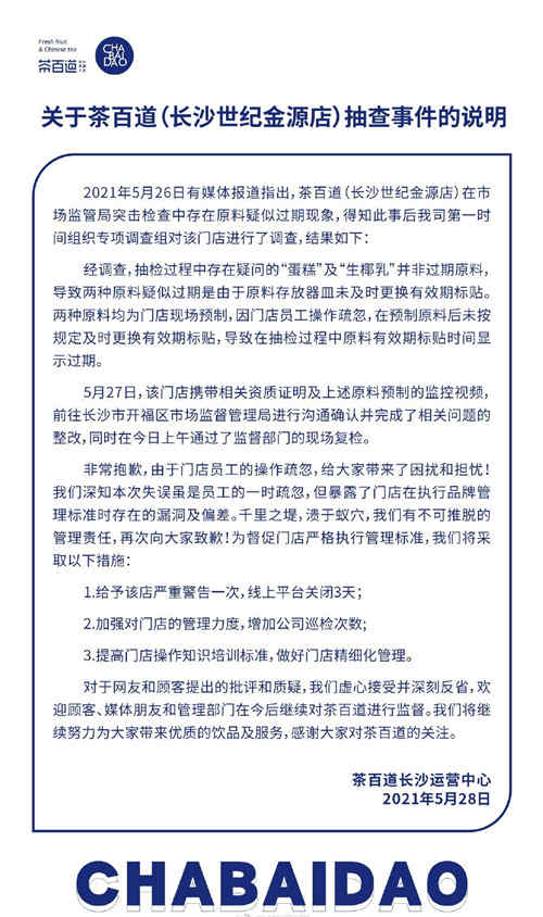 日前有报道称,茶百道长沙世纪金源店在当地市场监管局突击检查中存在原料疑似过期现象。5月28日晚间,茶百道发布声明称,得知此事后公司组织专项调查组对该门店进行了调查,疑问原料并非过期原料,是员工未及时更换有效标签。