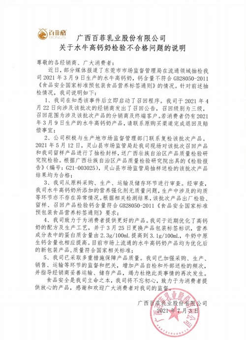 7月5日,广西百菲乳业股份有限公司(简称“百菲乳业”)在其官微发布关于水牛高钙奶检验不合格问题的说明,称公司在知悉相关事件后启动了三级召回,生产地广西灵山县市场监管局对涉事批次召回产品和公司留样产品进行了“复检”,结果均为合格。