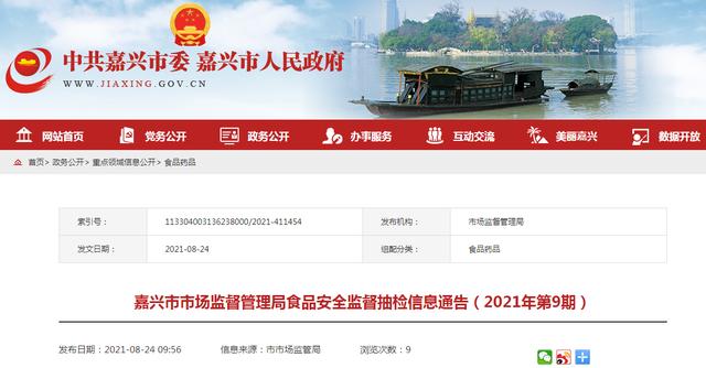 2021年8月24日,浙江嘉兴市人民政府网站发布嘉兴市市场监督管理局食品安全监督抽检信息通告(2021年第9期)。