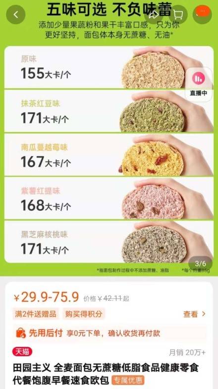快消品网在天猫旗舰店看到,“田园主义”宣称其全麦面包为“100%全麦粉含量,高膳食纤维,低脂肪”,“全麦面包销售额No.1”,有原味、抹茶红豆、南瓜蔓越莓、紫薯红提、黑芝麻核桃5种口味,其中原味全麦面包能量宣称值最低,为155大卡/个。不过根据专家依照样本实测值测算,“田园主义”原味全麦面包实际含有能量901千焦,约等于215大卡/个。