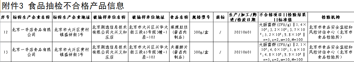 日前,记者从北京市市场监督管理局获悉,北京一手店食品有限公司生产的麻辣肚丝(酱卤肉制品)和夫妻肺片(酱卤肉制品)经检验“大肠菌群”不符合食品安全国家标准。