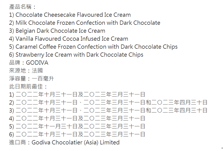 记者查阅公报显示,此次涉及的6款产品均为歌帝梵品牌,来源地为法国,净容量均是100毫升,最佳食用日期在2022年10月-2023年3月左右,进口商显示为Godiva Chocolatier (Asia) Limited。