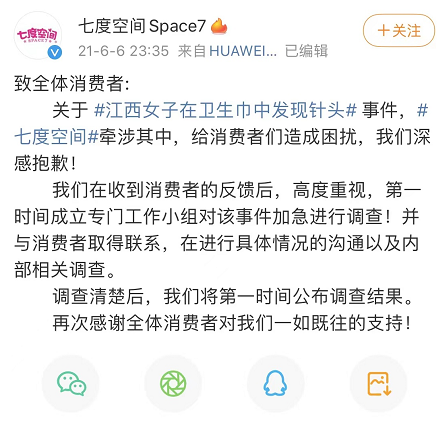 据媒体报道,去年6月5日,江西鹰潭的唐女士在其购买的七度空间卫生巾内发现针头,次日,七度空间回应称,公司已与消费者取得联系,第一时间成立专门工作小组对“卫生巾发现针头”事件加急进行调查,后会在第一时间公布调查结果。6月8日,唐女士向媒体反馈,称厂家已承认相关商品是正品,已由当地质监部门封存后交由集团调查处理。此后,七度空间暂未公布调查结果及处理方法。