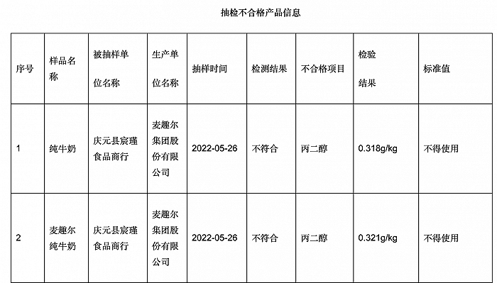 浙江省庆元县市场监管局公示2022年第4期食品抽检检验情况,结果检出标称麦趣尔集团股份有限公司生产的2批次纯牛奶不合格,抽样时间为5月26日,两款麦趣尔牛奶的品名分别为“纯牛奶”、“麦趣尔纯牛奶”,不合格项目为丙二醇,该项目的要求为“不得检出”。
