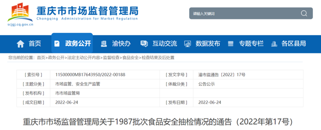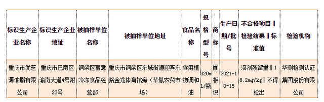 2022年6月24日,重庆市市场监督管理局网站发布关于1987批次食品安全抽检情况的通告(2022年第17号)。据通告,铜梁区富意冷冻食品经营部销售的、标称重庆市优芝源油脂有限公司生产的1批次“闻相识”食用植物调和油,溶剂残留量不符合食品安全国家标准规定。检验机构为