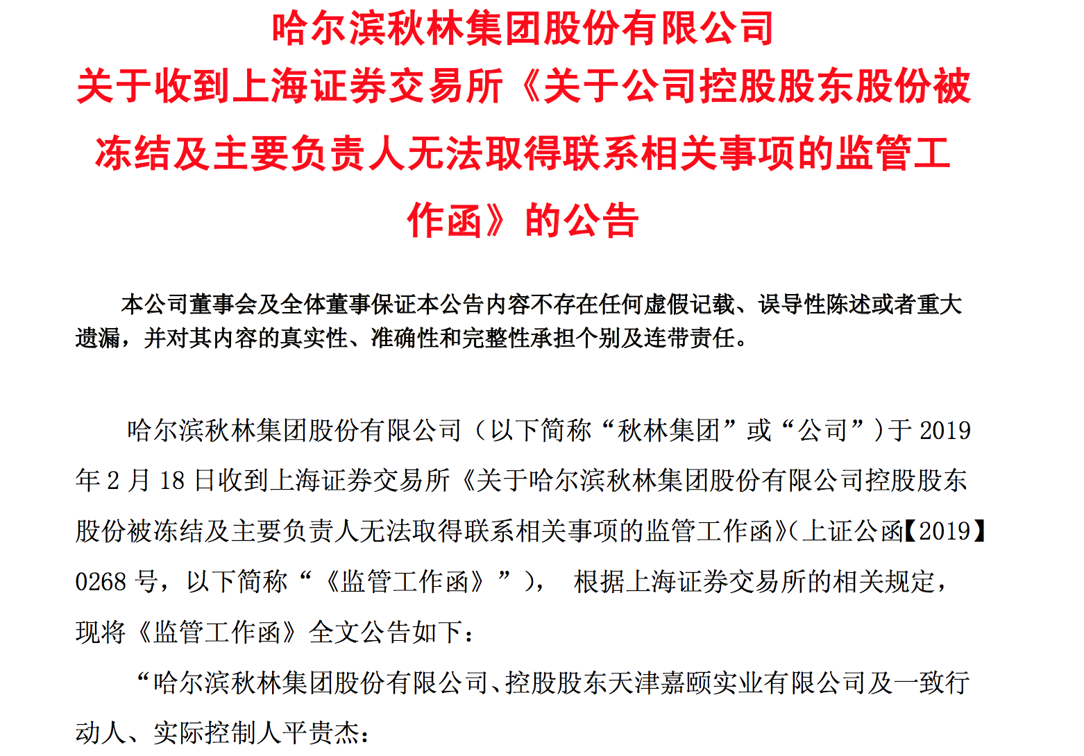 2月18日,上交所对秋林集团下发监管工作函,对其控股股东股份被司法冻结,无法与董事长李亚、副董事长李建新取得联系等相关事项所造成的影响,以及后续解决措施提出质询。