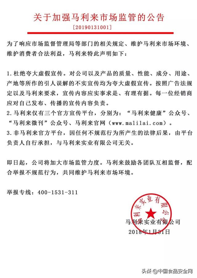 此外,《中国食品安全网》记者惊奇的发现,在今年4月马利来实业有限公司被批虚假宣传之前,2019年1月31日,马利来实业有限公司还发布了一个关于加强马利来市场监管的公告。