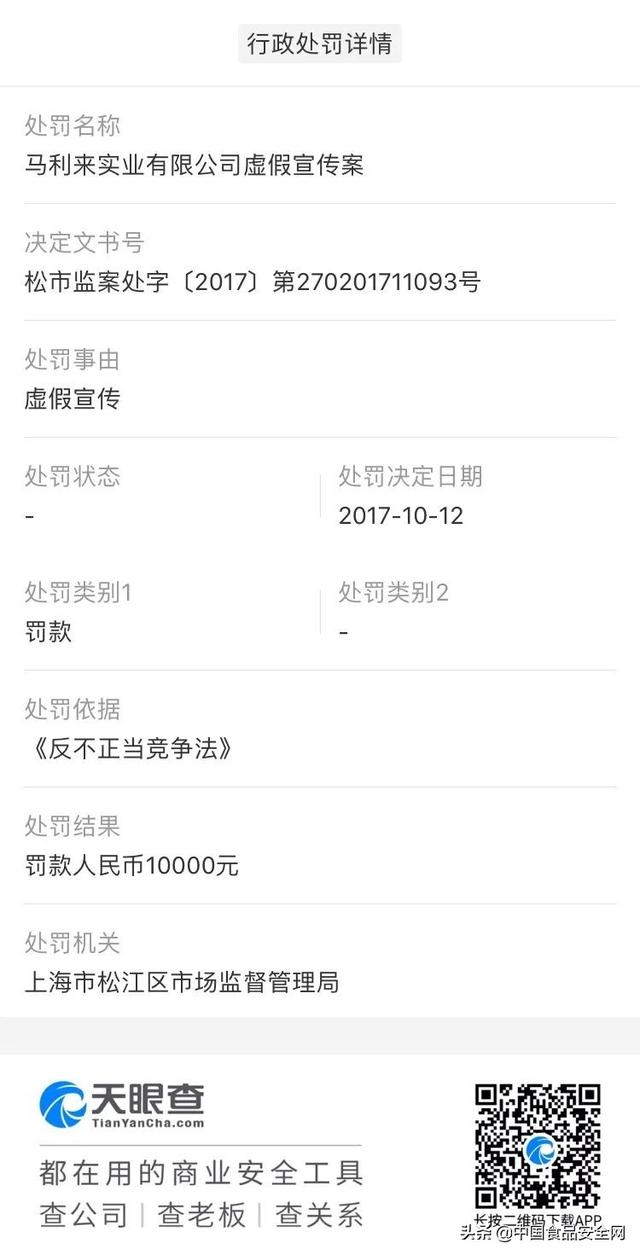 这其实不是马利来实业有限公司第一次被罚,据百度企业信用监管信息显示,2017年10月12日,马利来实业有限公司就被上海市松江区市场监督管理局因虚假宣传处罚过,罚款人民币10000元,行政处罚决定文书号:松市监案处字〔2017〕第270201711093号。