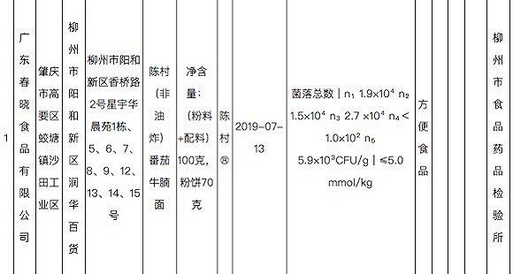 在柳州市市场监督管理局日前组织的食品监督抽检中,广东春晓食品有限公司2019-07-13生产的陈村(非油炸)番茄牛腩面,被检出菌落总数不符合国家标准。