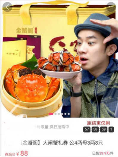 今年6月“六月黄”上市后,蟹券也进入预售期,商家借助明星直播带货的方式狂卖蟹券。金蟹阁即邀请王祖蓝直播卖货,有网友截图显示,券后价88元,内含公4两母3两共8只的大闸蟹礼券已售29.9万件。