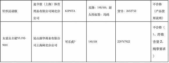 具体涉事产品为迪卡侬(上海)体育用品有限公司闸北分公司销售的一款针织运动服,该产品标称商标为KIPSTA,货号2652752,吊牌规格为140/68(耐久性标签规格为均码)。不合格项目为产品使用说明。
