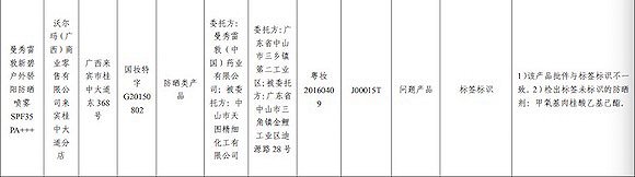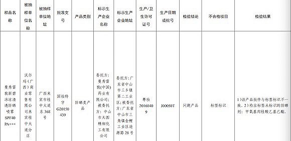具体来看,这两批次产品的标示生产企业名称均为曼秀雷敦(中国)药业有限公司委托、中山市天图精细化工有限公司加工,具体产品分为是,曼秀雷敦新碧户外骄阳防晒喷雾SPF35PA+++(标示批号G20150802)、曼秀雷敦新碧冰凉清透防晒喷雾SPF40PA+++(标示批号G20150439)。两批次产品都采样自沃尔玛(广西)商业零售有限公司来宾桂中大道分店。