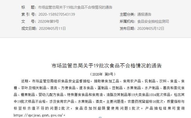 5月12日,市场监管总局发布关于19批次食品不合格情况的通告(2020年第9号)显示,市场监管总局对粮食加工品、食用农产品、水产制品等重点食品组织安全监督抽检。在全国抽检19大类食品1014批次样品。抽样检验项目合格样品995批次,不合格样品19批次。不合格样品涉及食用农产品、水果制品、酒类。主要问题是,农兽药残留超标16批次,质量指标与标签标示值不符的问题2批次,食品添加剂超限量使用问题1批次。