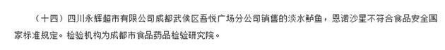其中,食用农产品不合格16批次中,第14条显示,四川永辉超市有限公司成都武侯区吾悦广场分公司销售的淡水鲈鱼,恩诺沙星不符合食品安全国家标准规定。检验机构为成都市食品药品检验研究院。