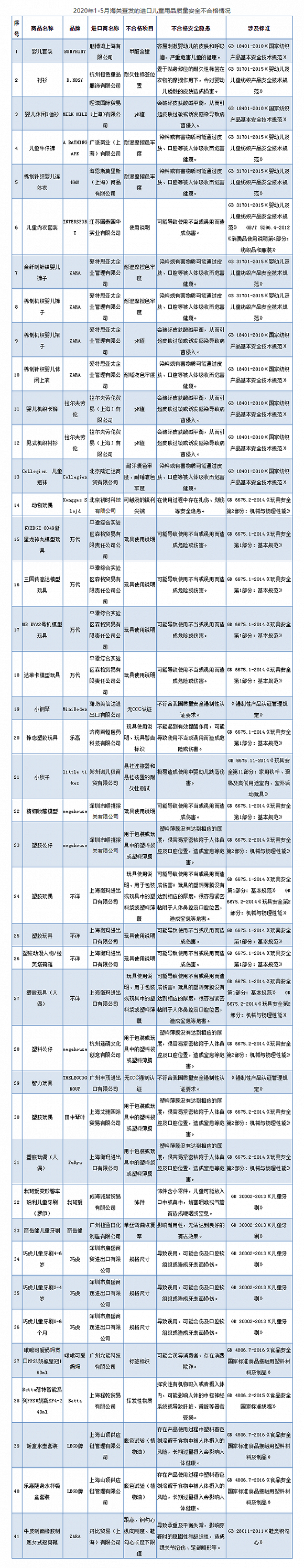 最近,海关总署对外公布了2020年1至5月查发的部分进口儿童用品质量安全不合格情况,涉及服装、玩具等6类41批次进口儿童用品,包括ZARA、H&M、乐高、万代在内的多个知名品牌上榜。