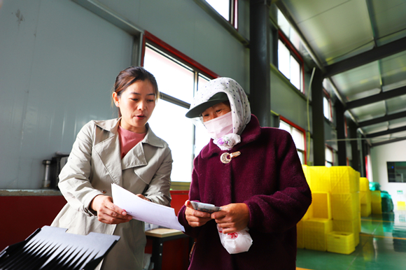 通渭县李家店乡祁咀村村民周栓花(右)将自己采摘的金银花交到收购点后与会计核对账目领取报酬。(王文嘉摄)