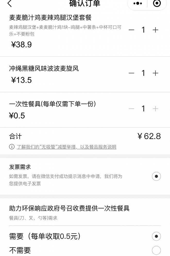10月15日起,不少人在深圳市麦当劳门店、小程序点餐后发现,麦当劳不再提供免费餐具,如果要使用叉子、勺子、筷子等,顾客需额外支付0.5元。