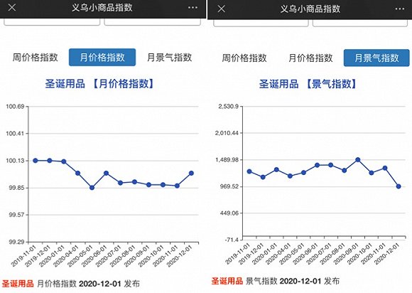 快消品网了解到过去一年(2019年11月1日-2020年12月1日)圣诞用品的月价格指数趋势显示,圣诞用品价格从去年11月滑落至今年5月,6月逐步回暖,在今年12月明显增长,但未能达到去年同期的价格;景气指数则是在今年9月达到峰值,此后折线式回落,至今年12月到低谷。