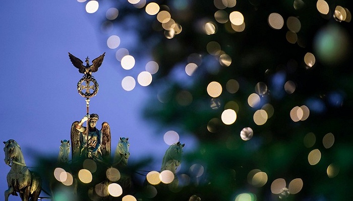 2020年11月29日,德国柏林,勃兰登堡门前的圣诞树及附近彩灯被点亮。