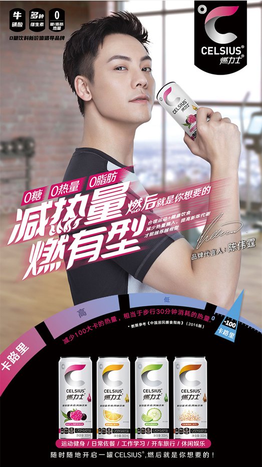 2019年6月,“CELSIUS燃力士”官宣中国香港著名演员&歌手陈伟霆出任其品牌代言人。陈伟霆自律、正能量、积极的生活态度与“CELSIUS燃力士”的品牌理念不谋而合,此次深度合作向更多的消费者传递科学运动+合理膳食+“Celsius燃力士”的健康生活新理念。
