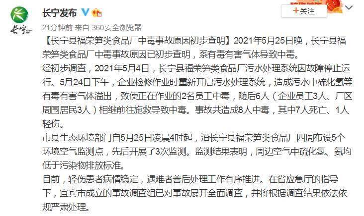 2021年5月25日晚,四川省宜宾市长宁县福荣笋类食品厂中毒事故原因已初步查明,系有毒有害气体导致中毒。