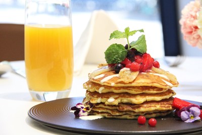 香蕉玉桂饼:牛奶、鸡蛋制成的烤饼,撒上少许可可粉,淋了酸奶、蜂蜜,放上烤熟的香蕉片、红加仑、草莓、蓝莓、薄荷叶,配以新鲜橙汁,滋味丰富而有层次,让悠闲的晨间时光更加美妙。